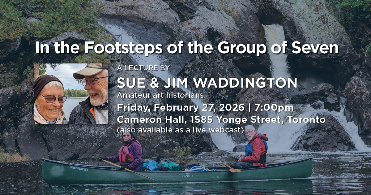 For almost five decades, Sue and Jim Waddington have searched for places that inspired the Group of Seven painters and Tom Thomson. They especially enjoy locating sites that can only be reached by canoe and foot. Their lecture will compare photographs of some of the 800 painting sites they have found with the corresponding artwork. They will discuss how they find the painting sites and what they have learned about the painters and their art. Since the artists did not keep detailed records of where they worked, each picture represents a puzzle to be solved. For each of the about 800 places located, Sue and Jim photographed the scene and compared it with the artists’ impression. In their talk, Sue and Jim will show their photographs alongside art from Killarney, Algonquin, Neys, Lake Superior and Bon Echo Provincial Parks, the Georgian Bay Islands, Nova Scotia, BC, the Yukon and Nunavut.